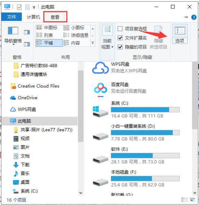 1、首选我们打开我的电脑点击导航功能上的“查看”,然后再点击右侧的“选项”,如下图所示;