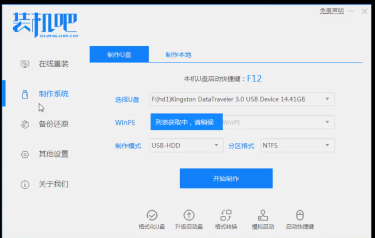 1.首先下载安装并打开装机吧,进入软件后选择“制作系统”。
