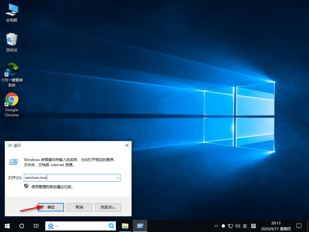 1、同时按下win+r键打开运行窗口,输入services.msc,点击确定。