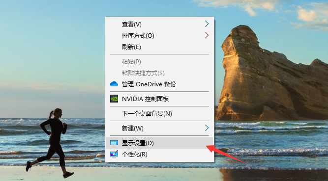 1、首先,在Win10的桌面点击鼠标右键,选择“显示设置”