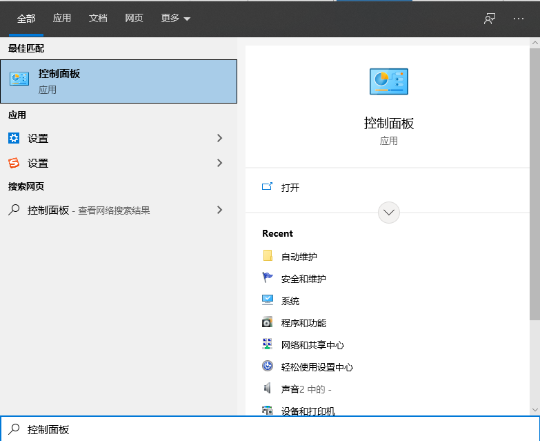 1、按下win+S,输入“控制面板”,点击进入控制面板。