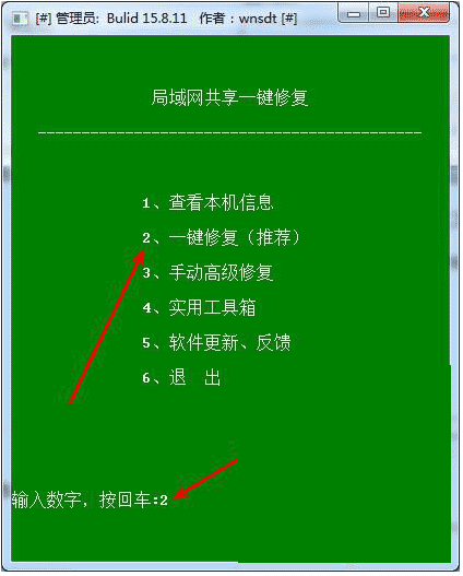 1、首先先去网上搜索下载win10局域网共享一键修复工具安装并打开,软件采用CMD命令界面,输入功能代号,就可以执行这一项。