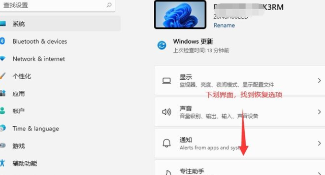 1、win+i组合键唤出“设置”对话框,按图下拉界面,找到“恢复”选项。
