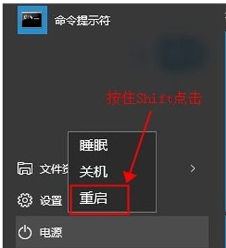 1.点击电脑左下角打开开始菜单,点击菜单里的”电源“,在按住“Shift键”的同时点击“重启”选项。如图所示: