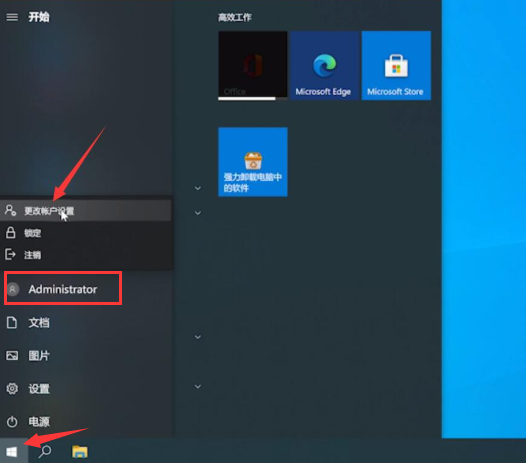 1.首先我们点击开始菜单,点击我们的windows账户的头像,出现三个选项中,选择”更改账户设置“。