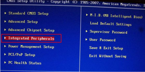 1.启动计算机时,不断按Delete.F2.F1等按钮进入BIOS,按↓键盘按键选用IntegratedPeripherals,按回车键。