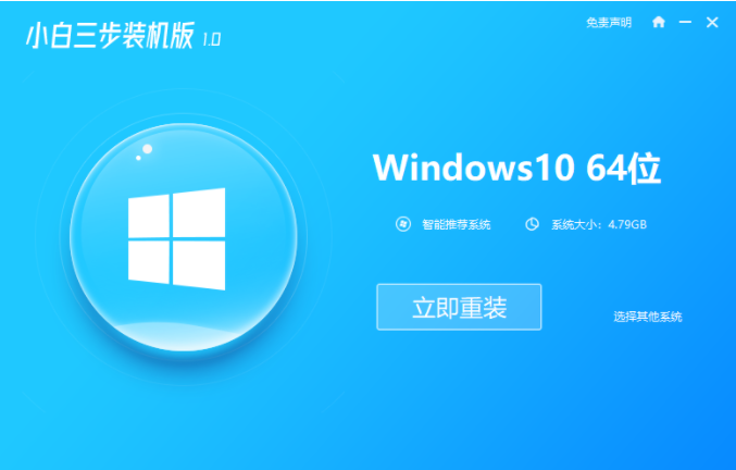 1.打开浏览器,百度小白官网,下载小白三步装机版软件并打开,默认会建议我们安装Windows10,点击立即重装。提醒,重装建议退出安全软件。