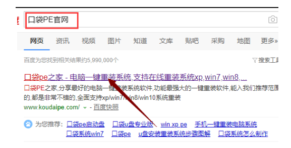 1、打开网页搜索引擎搜索“口袋PE官网”到官网内下载口袋PE软件。
