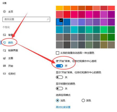 1、首先我们单击开始菜单→设置—>个性化—>颜色,开启【便“开始”菜单、任务栏和操作中心透明】选项,如下图所示。