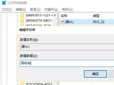 5、点击该新建项,右侧的“默认”修改其数值数据为“回收站”。