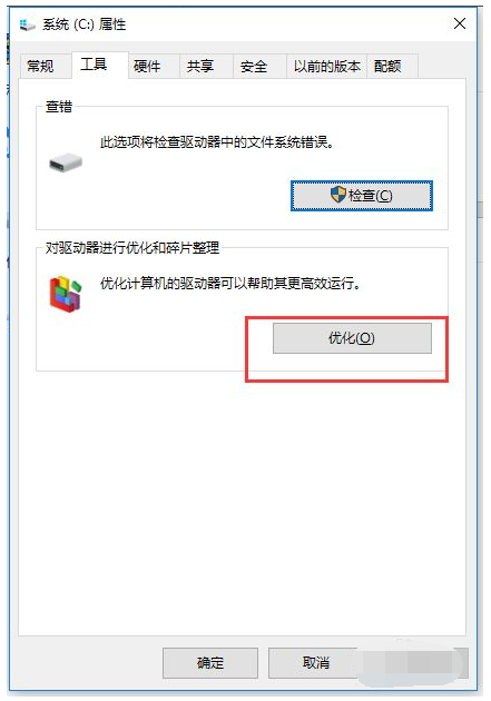 3、同样的选中c盘,右键--》属性--》工具--》优化。耐心等待优化完成。