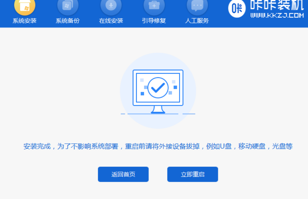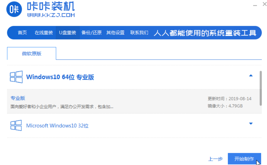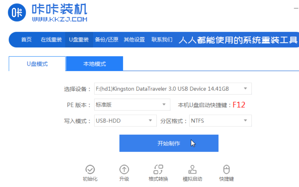 1、在一台可用的电脑上下载安装咔咔装机一键重装系统工具并打开,插入一个8g以上的空白u盘,选择u盘重装系统模式,点击开始制作。