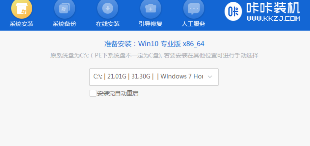5、在pe系统桌面上打开咔咔装机工具,然后选择win10系统点击安装。
