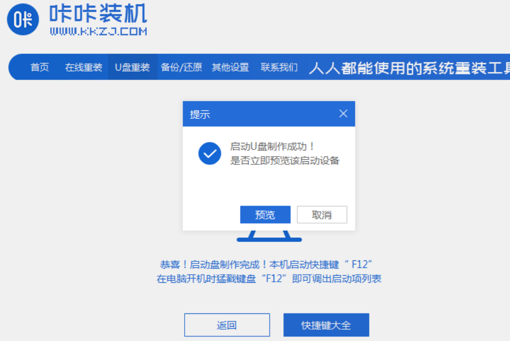 3、等待软件制作u盘启动盘成功后,可先预览对应的组装机主板的启动热键,然后再拔除u盘退出。