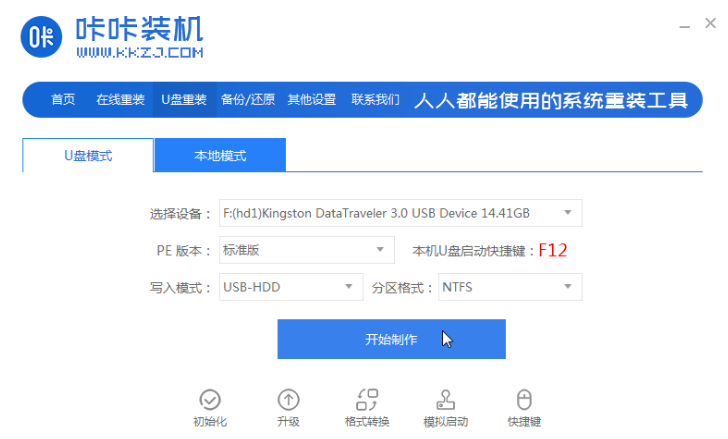 1、下载安装咔咔装机一键重装系统工具并打开,插入一个8g以上的空白u盘,选择u盘重装系统模式点击开始制作。