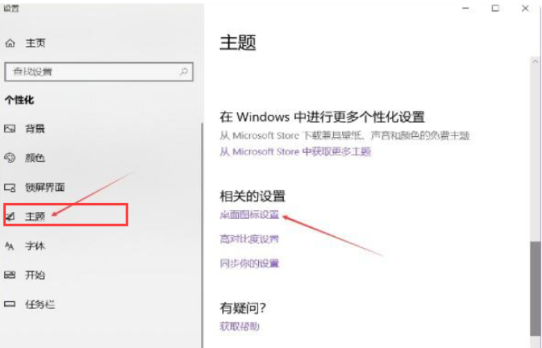 2、在弹出的窗口中我们找到并点击【主题】选项,接着下滑右边栏找到【桌面图标设置】按钮并点击。