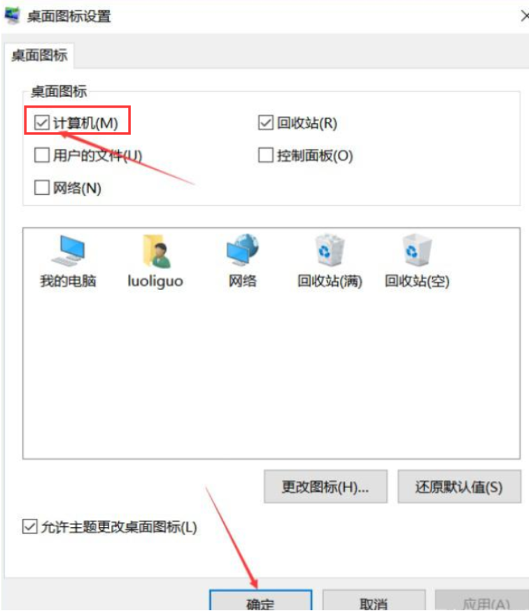 3、最后我们在弹出的桌面图标设置窗口中将【计算机】功能勾选上,接着点击【确定】即可,这样我们桌面上的我的电脑图标就恢复啦。