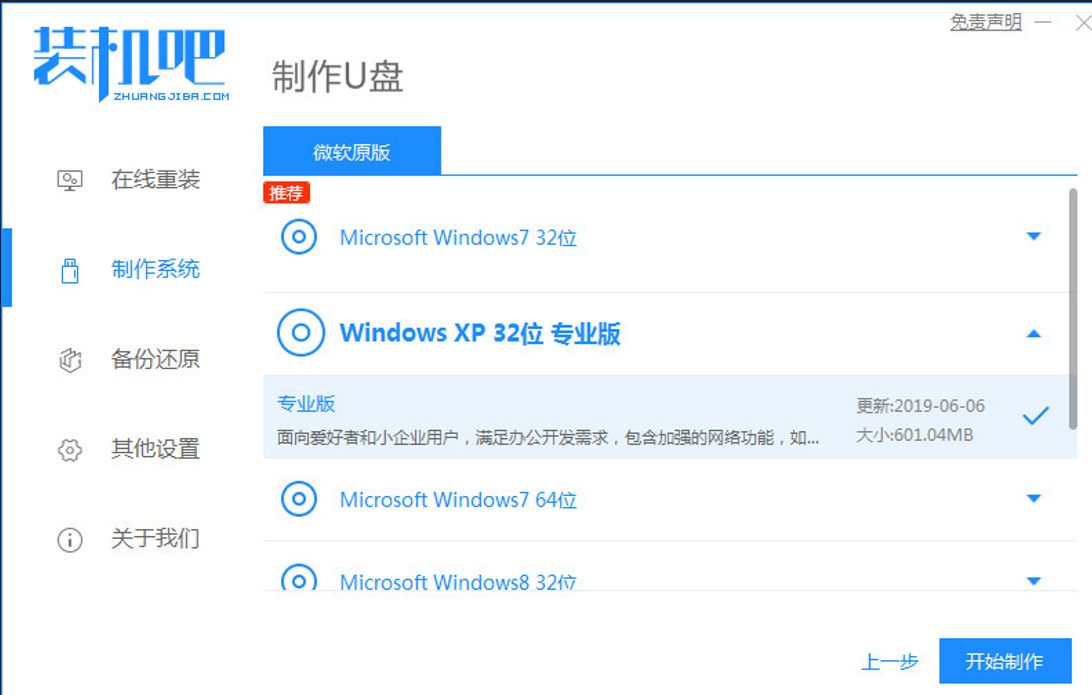1、下载一个装机吧一键重装系统软件并打开。准备一个8GB以上的U盘。选择制作系统,在制作U盘中选择您的U盘,其它参数默认直接开始制作即可。