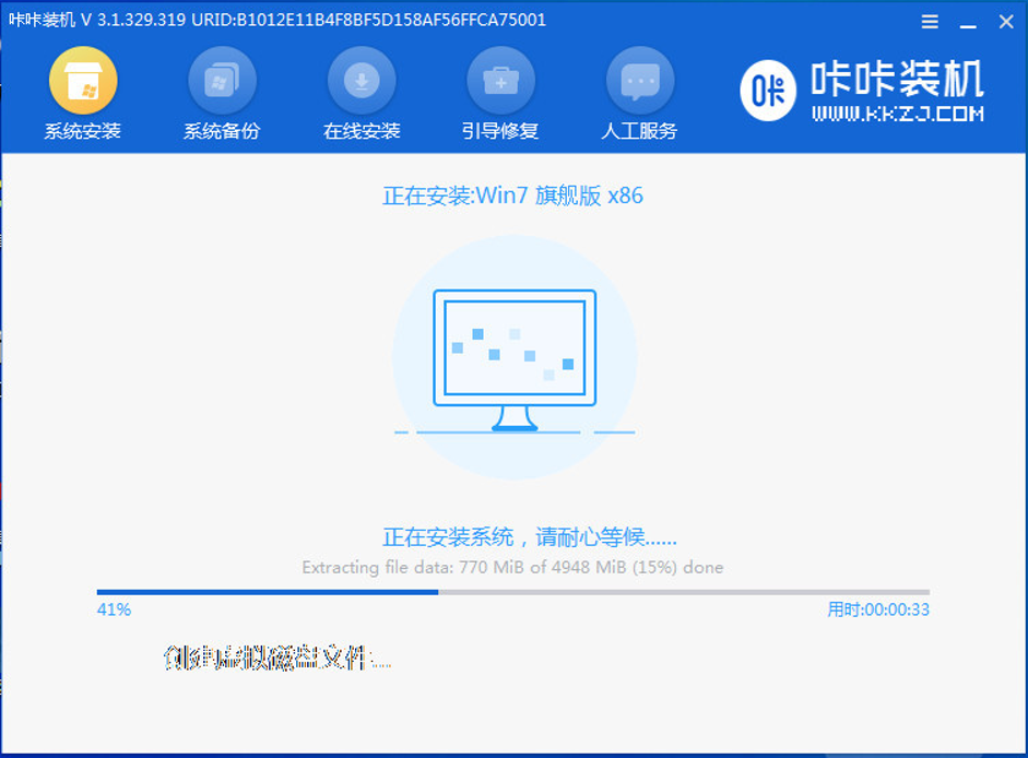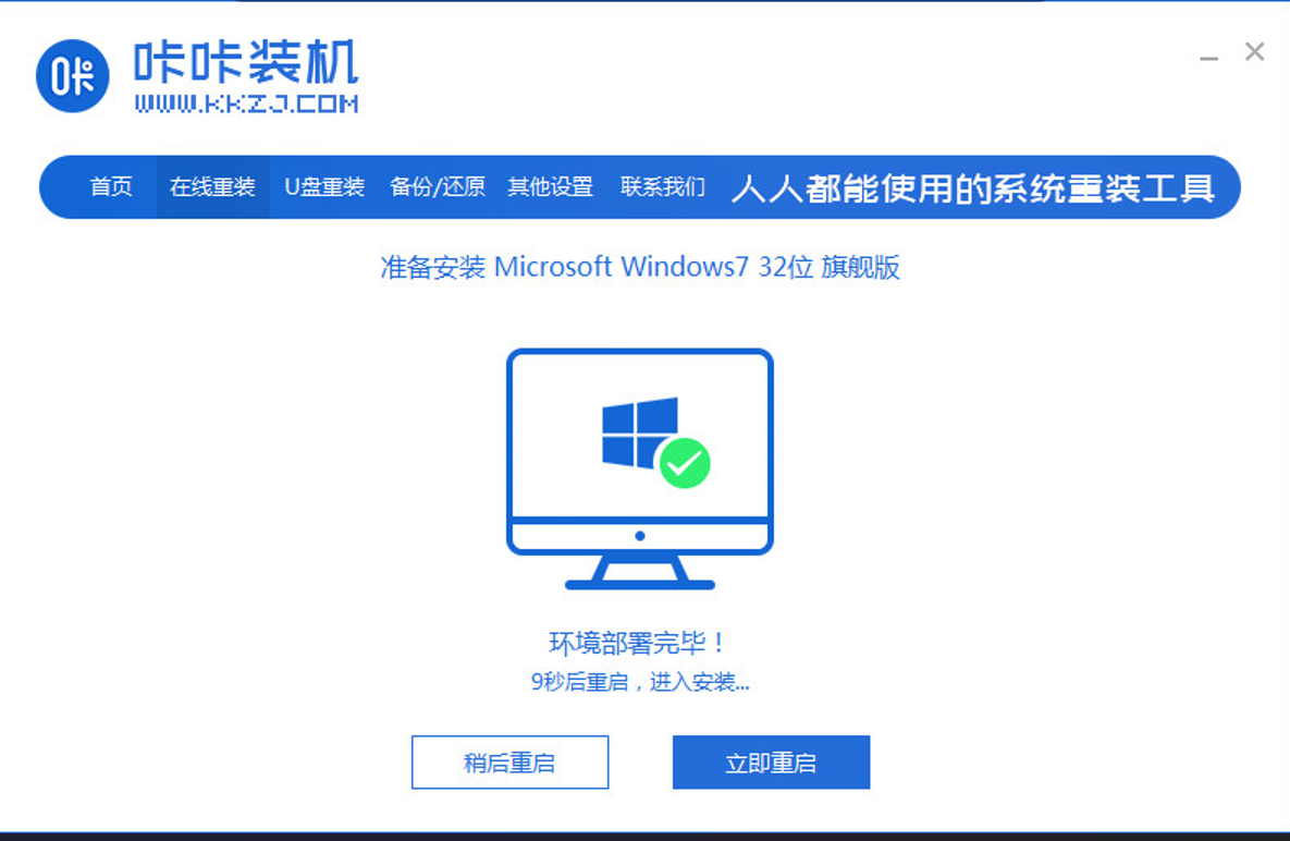 1、下载安装咔咔装机工具,选择在线重装,选择要安装的系统版本,点击下一步。