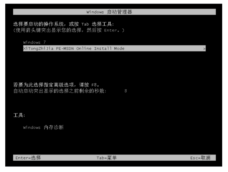 5、接下来我们会进入到windows启动管理器界面,选择第二个进去pe系统安装界面。