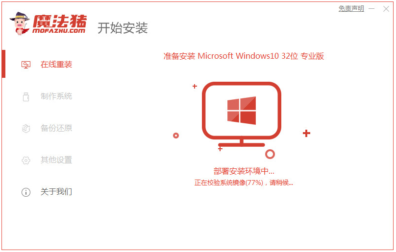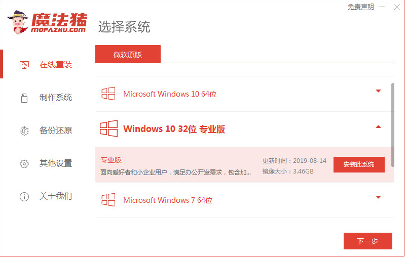 1.当电脑重装系统win10时,首先我们在桌面上打开“魔法猪系统重装大师”工具,点击win10系统,选择“安装此系统”。