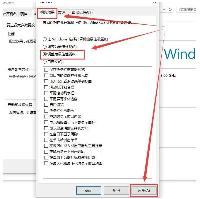 4、然后勾选上“调整为最佳性能”,然后点击应用,就行了。