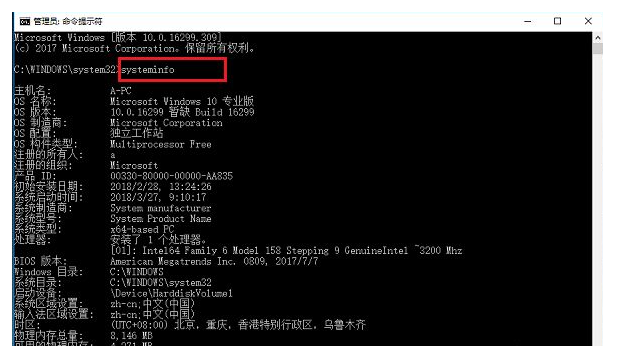 2、进去之后,输入systeminfo命令,按回车键可以看到电脑的配置信息,系统型号,类型,制造商,物理内存,虚拟内存,处理器等。