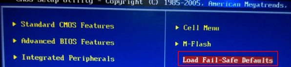 2、进入bios设置界面后,选择“Load Fail-safe defaults”选项回车,意思是载入bios预设值。