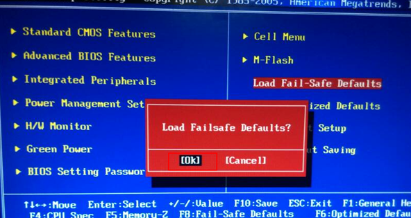 3、系统会弹出提示“Load Fail-Safe Defaults Ok Or Cancel”,我们选择“ok”确定恢复出厂设置,然后再按下f10键保存并退出bios界面即可。
