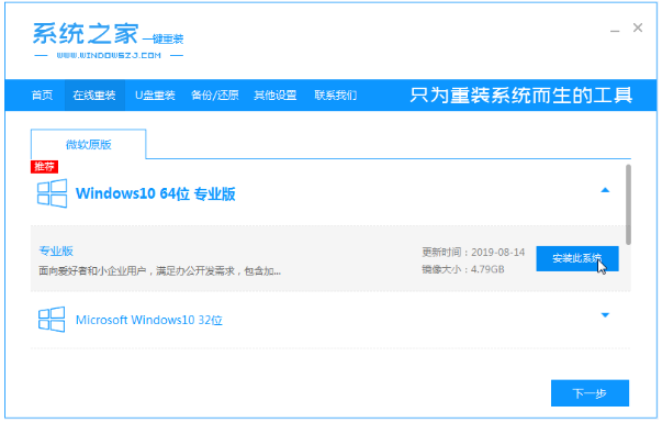 1.进入官网下载系统之家一键重装系统工具到电脑上,双击打开,点击在线重装,选择需要安装的win10系统,点击安装此系统。(安装前注意备份重要信息,关掉电脑上的杀毒软件,避免被拦截)