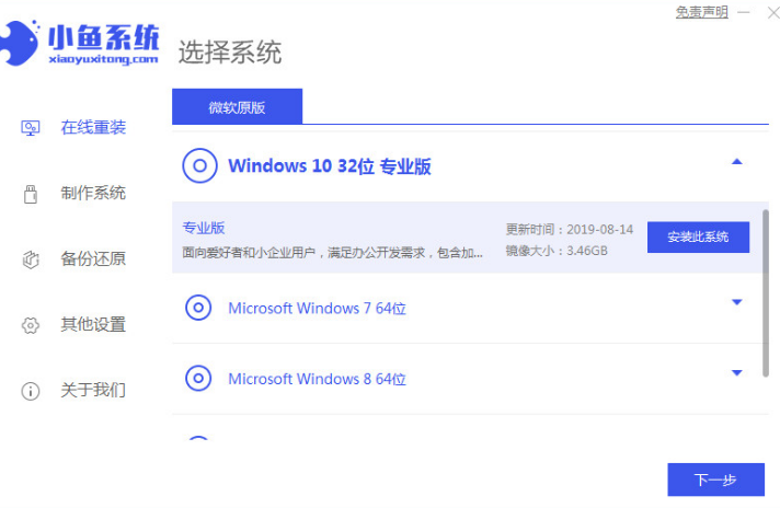 1.下载安装小鱼一键重装系统工具打开选择win10专业版安装;