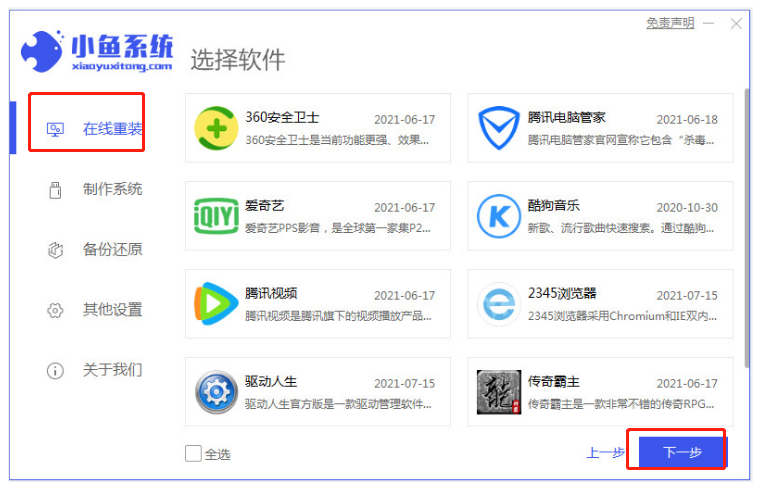 2、在“在线重装的界面中”选择想要安装的软件再点击“下一步”。