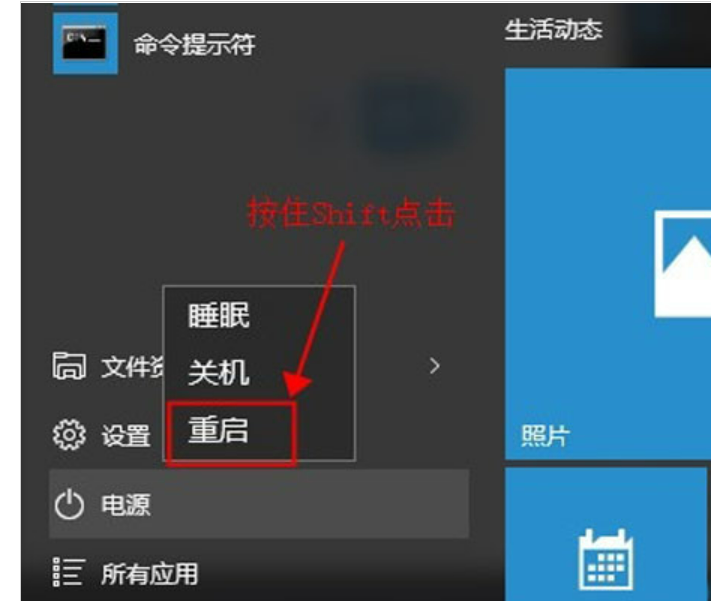 1. 打开“开始菜单”,点击“电源”选项,会弹出一个选择菜单,此时按住“Shift键”, 然后点击“重启”选项;