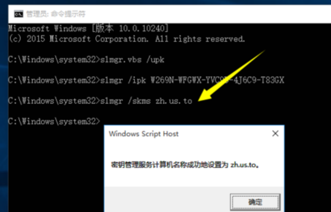 4.当输入以下命令:slmgr /skms zh.us.to,回车弹出“密钥管理服务计算机名成功的设置为zh.us.to”的提示。