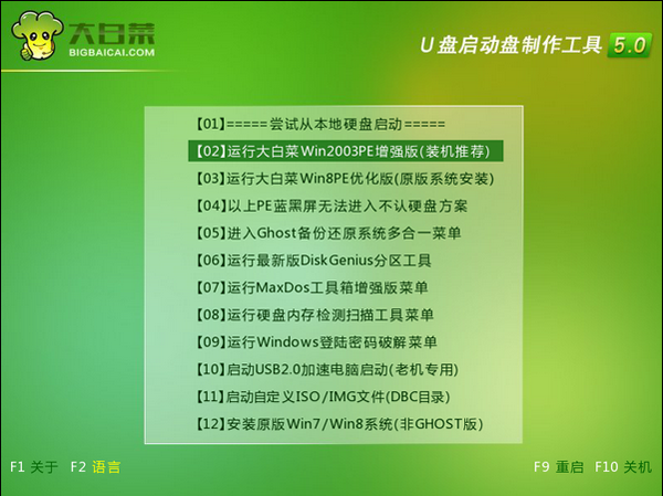 5.完成选择以后按回车键进行确认即可,然后就能够进入到大白菜主菜单界面了。如下图所示: