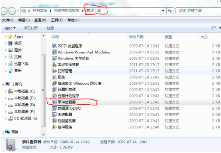 5、依次点击开始--控制面板--管理工具--事件查看器,查找电脑已卸载软件的记录。