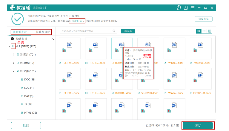 步骤3:得出扫描结果。扫描结果将会按照保存路径和文件类型分类排列并呈现在用户面前,用户可以点开相应的文件夹去寻找文件。如果第一次扫描没有搜索到想要的数据,用户可以使用“深度扫描”模式进行扫描。它将从U盘中搜索更多文件,同时也将花费更多时间。用户还可以点击盘符前的小方框进行全选。选中文件后点击右下角的「恢复」。