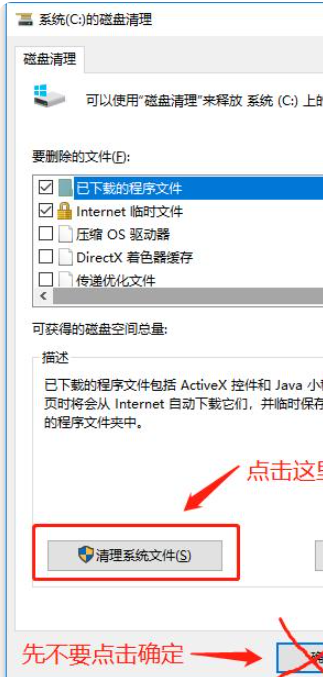 4、会弹出“硬盘清理”对话框,别着急点“确定”,点击“确定”左上角的“清理系统文件”