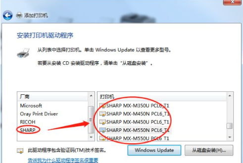 7、在这里选择需要安装的打印机具体型号,我这里是sharp>MX M350U。