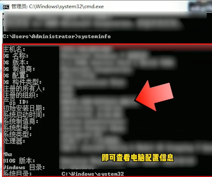 命令提示符界面中输入“systeminfo”查看电脑配置。