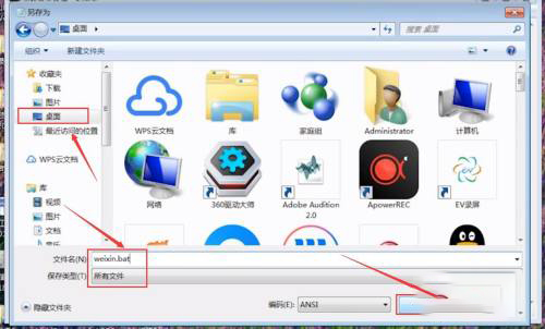 6、在另存为项目中选择桌面,保存类型选择“全部文件”,修改文件名并将后缀改为“.bat”,然后保存。