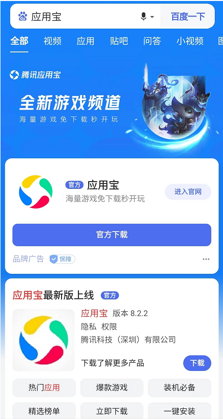 1、应用宝下载安装2022最新版方法,首先浏览器搜索应用宝。