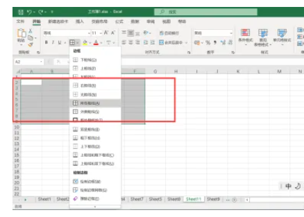 2、在菜单栏上点击”开始-框线“,下拉选择所有框线,选中单元格区域添加上表格框线。