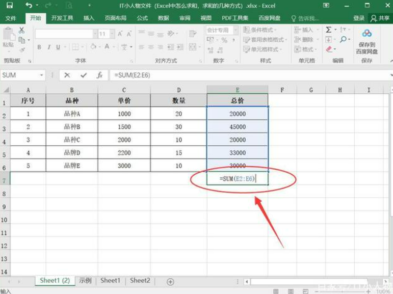 在单元格中输入公式【=SUM(E2:E6)】。