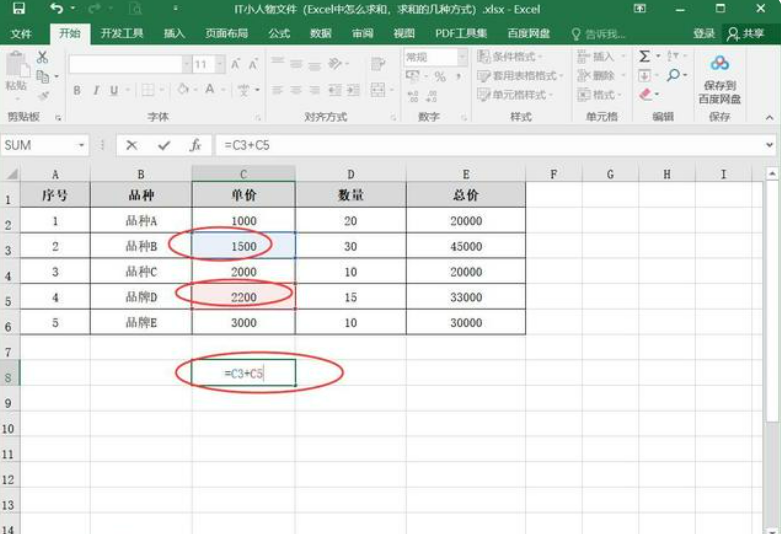 在单元格中输入"=C3+C5……",其中C3、C5表示要相加的单元格位置。