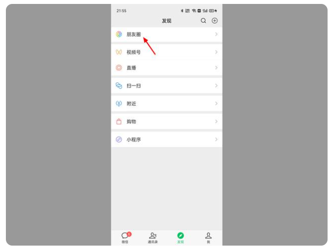 2、在发现页面,打开最上方的【朋友圈】。