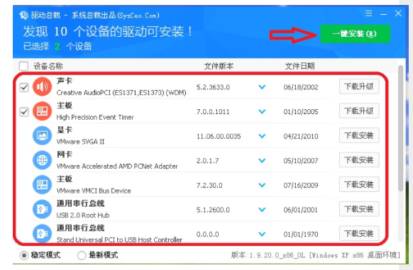 3、选择想要驱动安装或更新的软件。点击界面右上方【一键安装】。