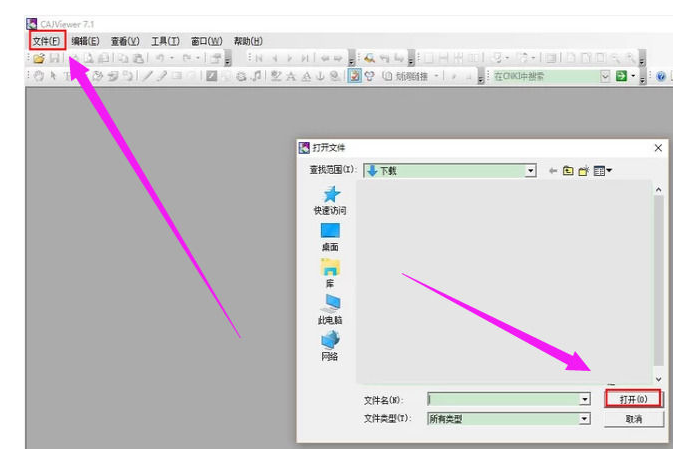 3、击左上角的“ 文件—> 打开 ”,选择需要打开的CAJ文件,选择完成,点击“ 打开 ”。