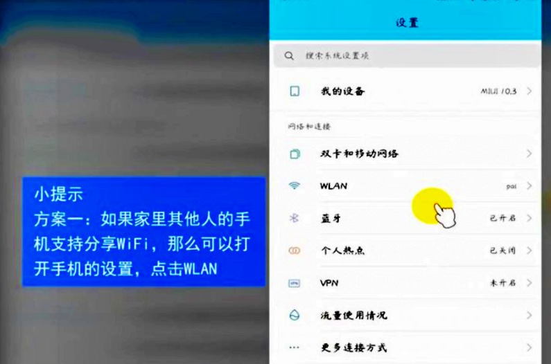 1、如果有其他人的手机支持分享WiFi(一般安卓手机),那就可以打开手机的设置,点击“WLAN”无线连接进入。