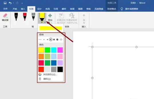 3、点击需要笔的右下角的倒三角图标,然后选择画笔颜和粗细。
